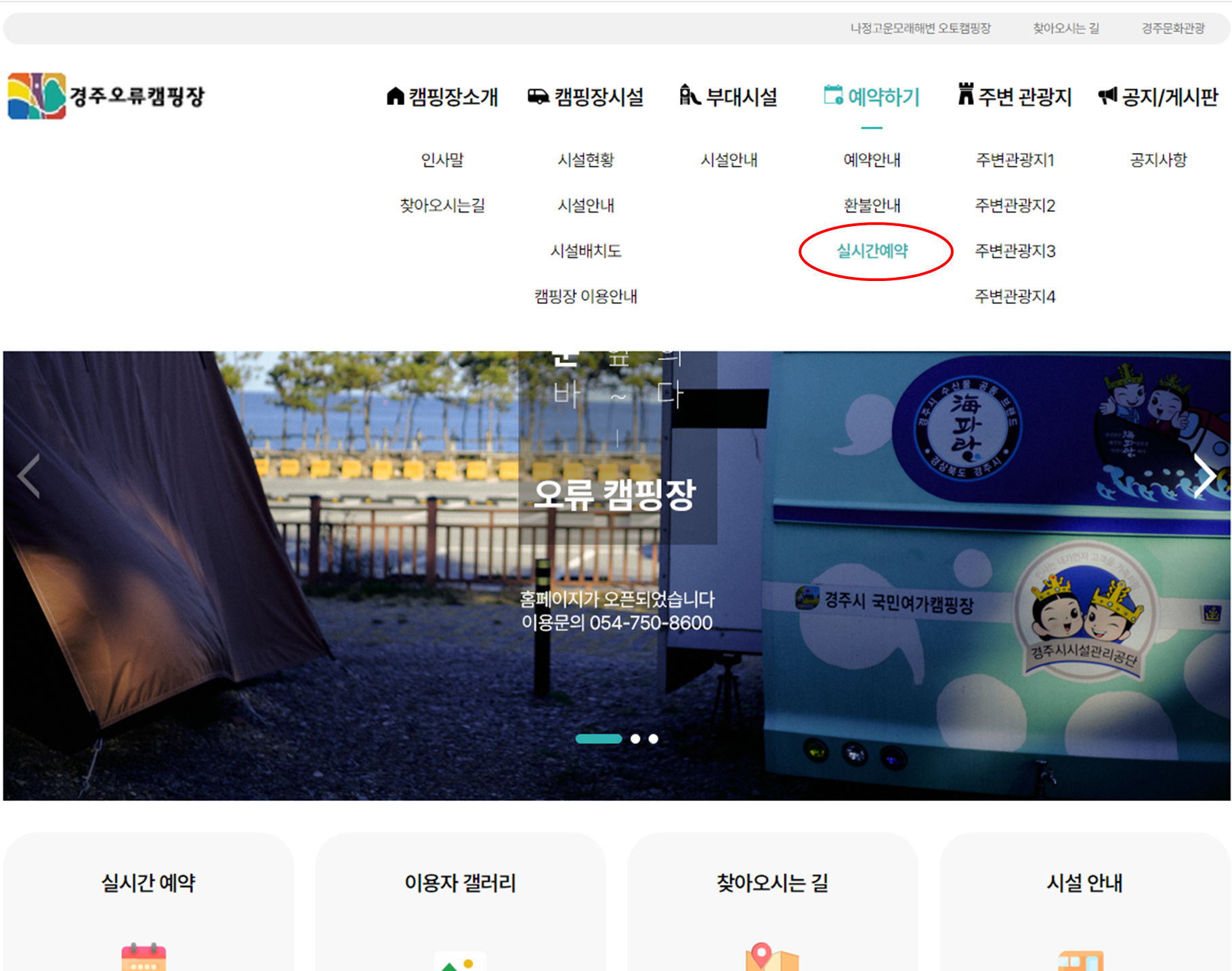 홈페이지 접속 후 ‘실시간예약’을 클릭합니다.