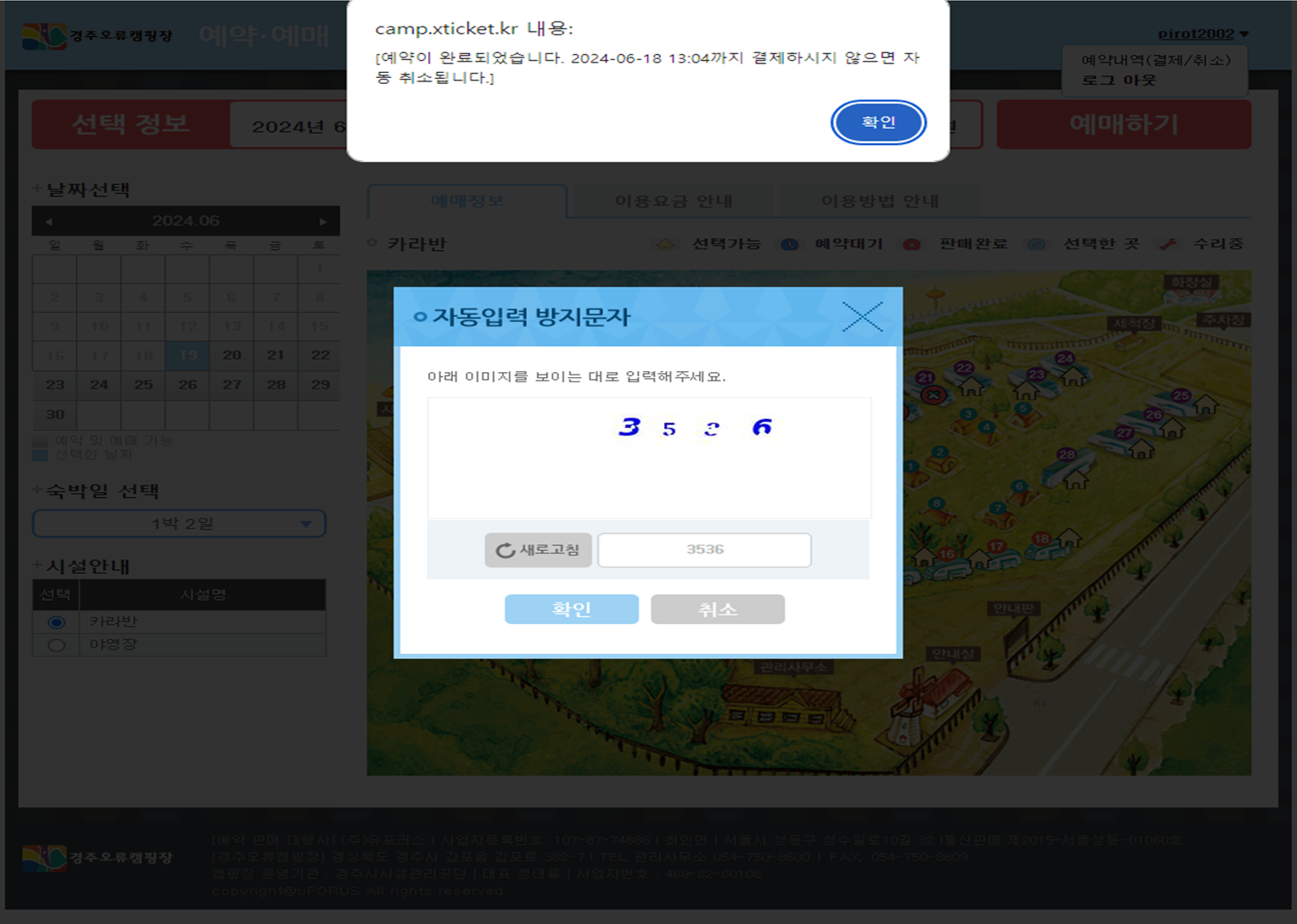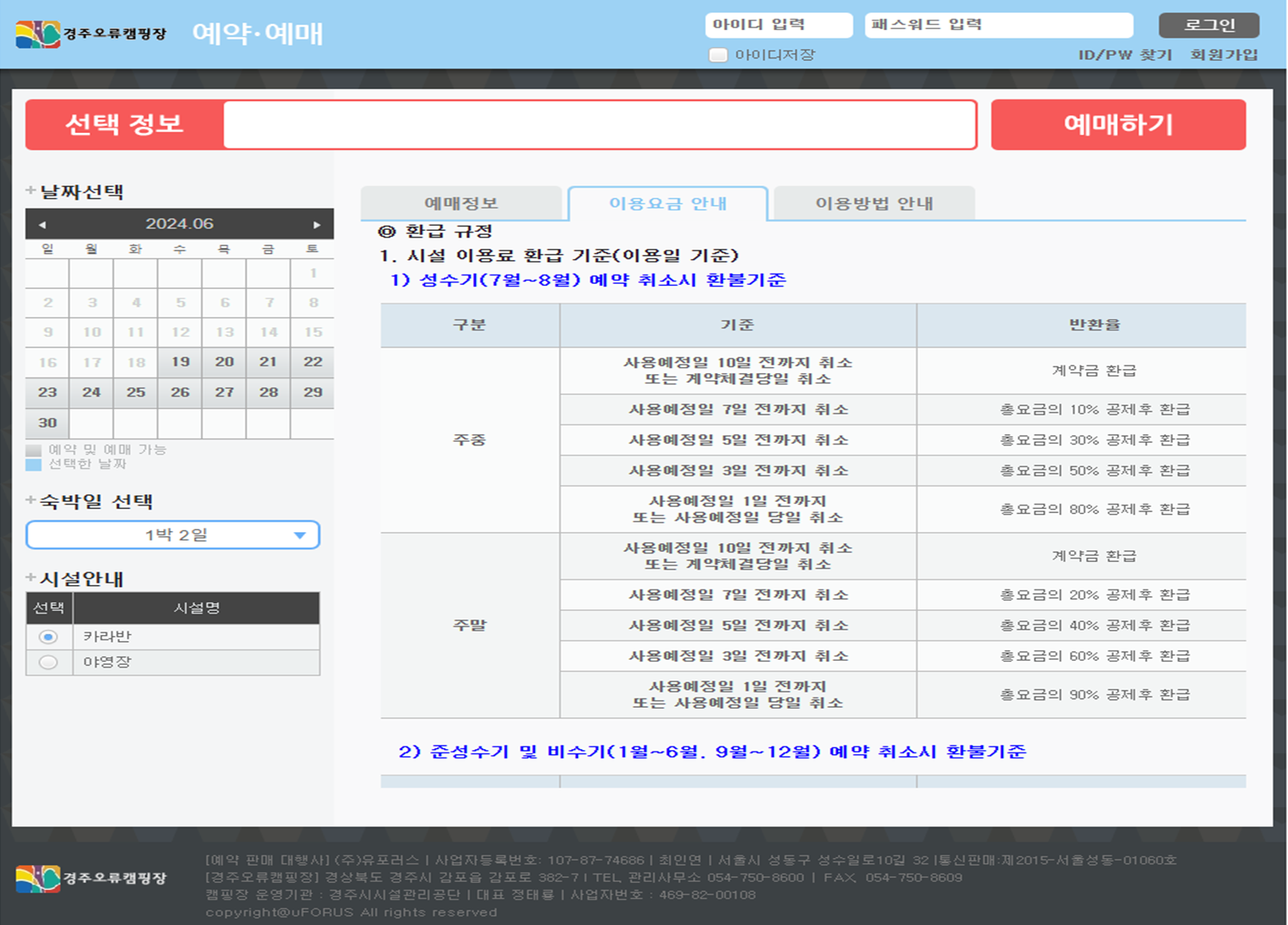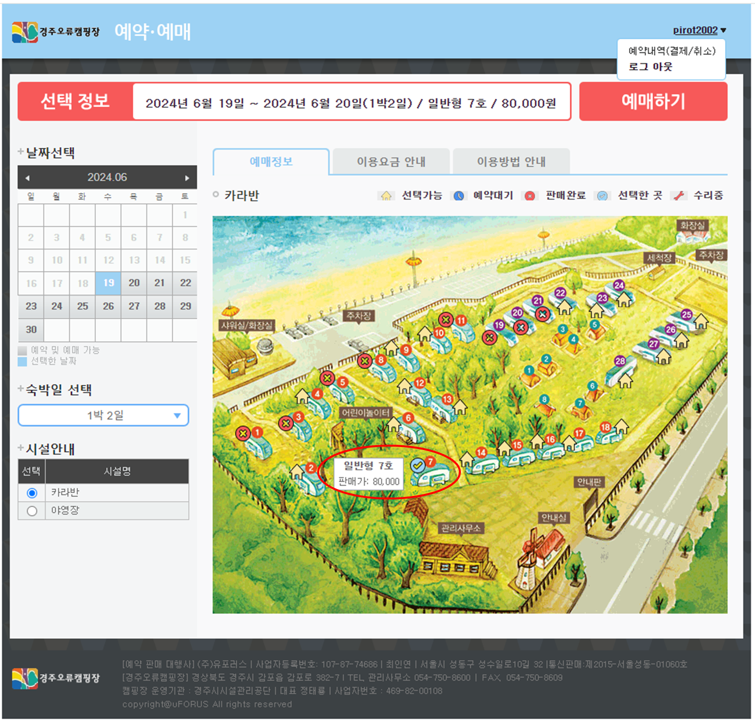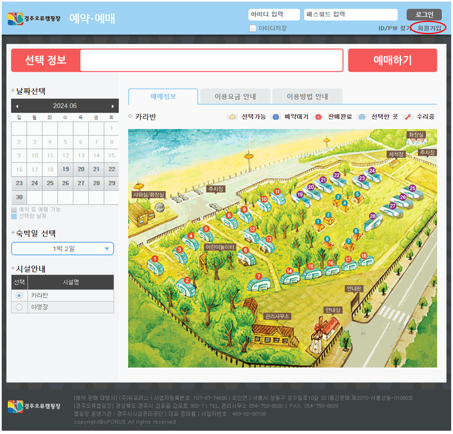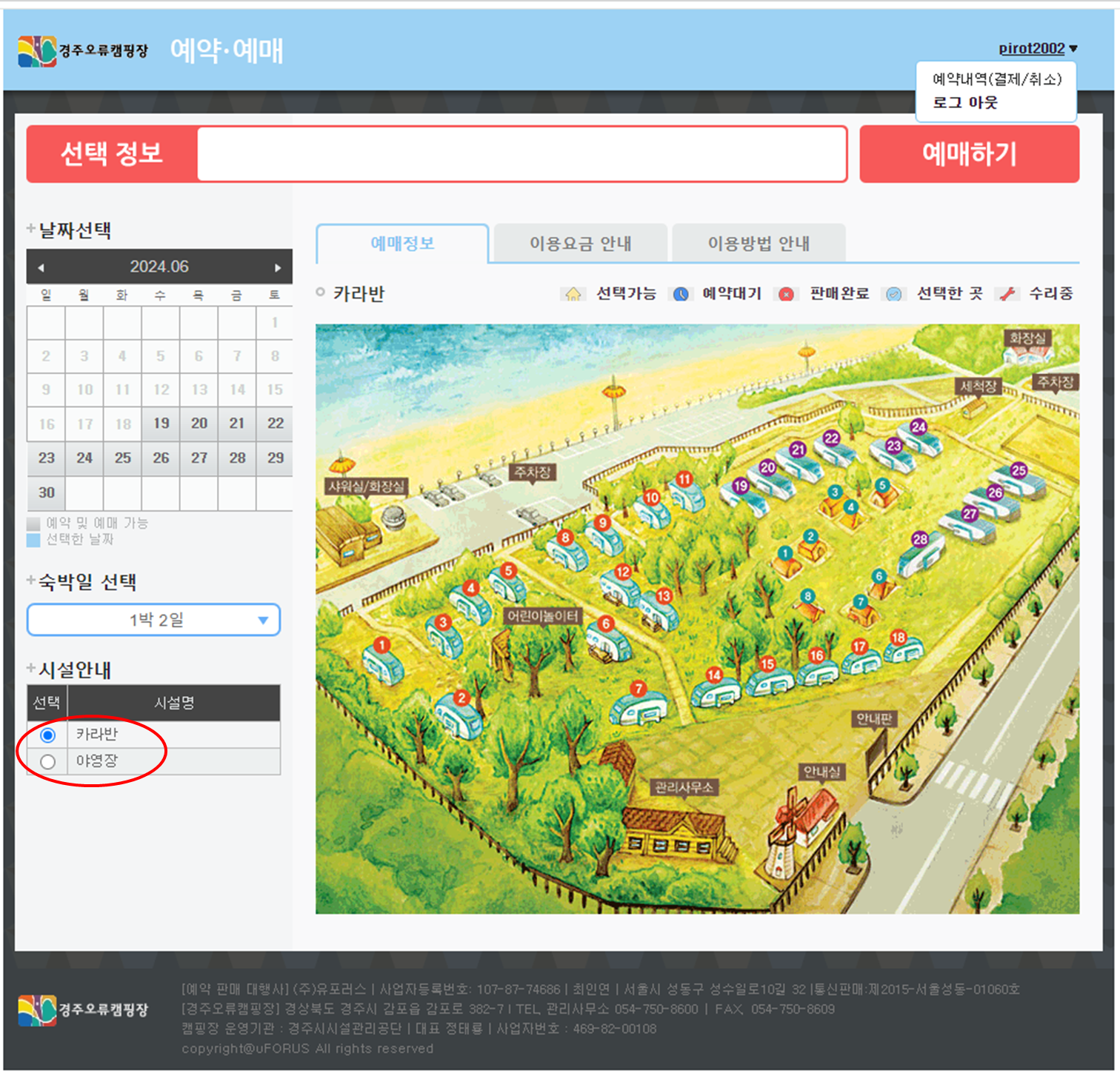 좌측 하단의 시설안내에서 카라반 혹은 야영장을 선택합니다.