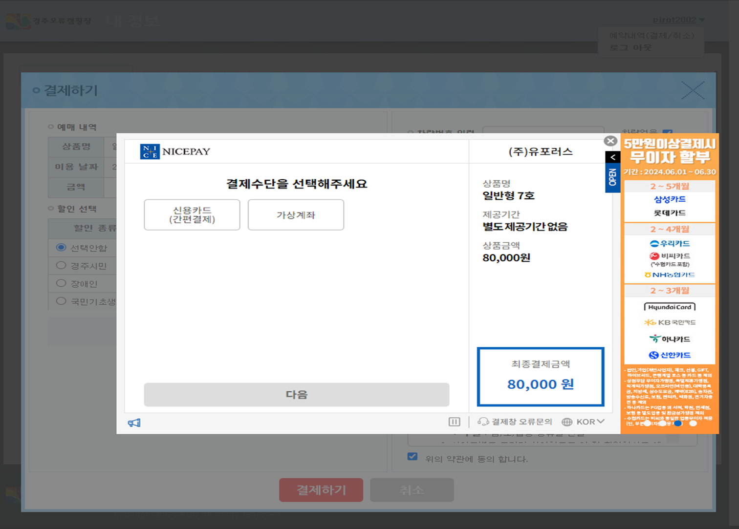 그 후 신용카드(체크카드) 혹은 가상계죄로 입금하시면 됩니다.