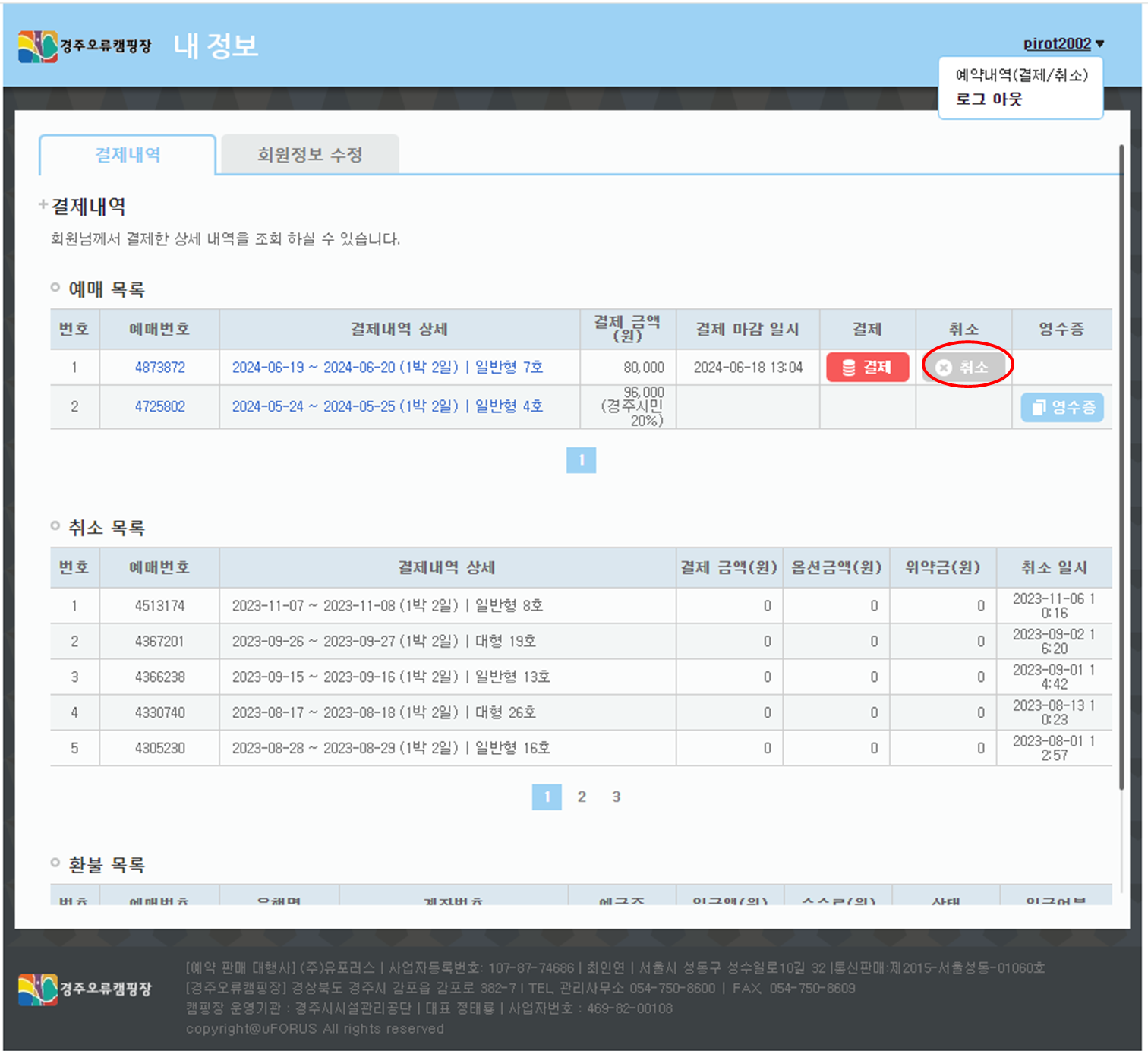 제목 오류캠핑장 예약(취소)방법 안내 (데스크탑, 노트북) 등록일 2023-12-07