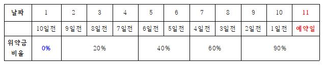 예약일이 평일(11일)이라 가정하면 10일 전인 1일 까지는 위약금이 없으며 그 이후 날짜가 지날 때 마다 위약금이 적용됩니다.