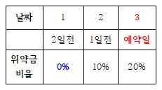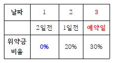 예약일이 평일(3일)이라 가정하면 2일전인 1일 까지는 위약금이 없으며, 1일 전인 2일 부터 위약금이 적용됩니다.